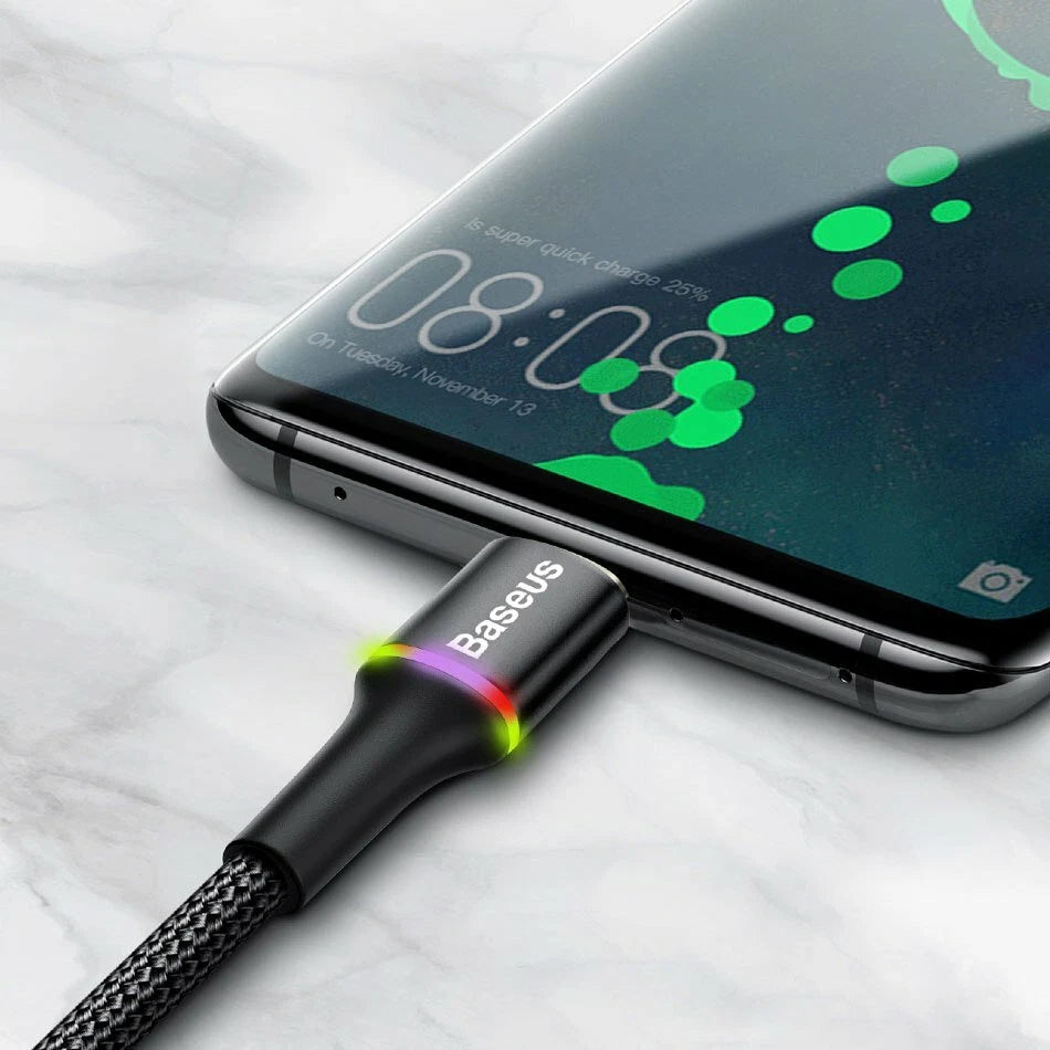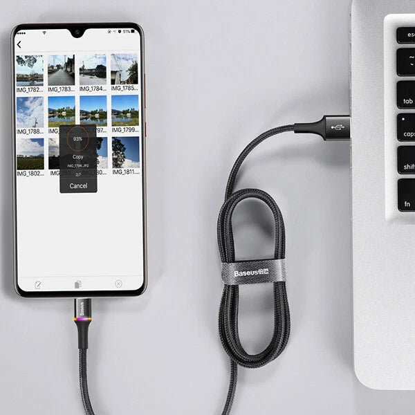 Baseus HALO - ist ein hochwertiges USB-Kabel mit einer Länge 2 Meter, dank denen wir schnell und sicher aufladen können Ihre Ausrüstung. Mit dem Kabel können wir auch übertragen und Empfangen von Daten wie Fotos, Musik, Filmen usw. Das Kabel war mit einem Nylongeflecht überzogen, was erheblich war verlängert die Lebensdauer des Produkts. Der Ort, an dem das Kabel an den Stecker anschließt, ist mit einem Einsatz abgedeckt, auf dem Es gibt eine LED-Anzeige. Wenn das Gerät angeschlossen ist Die Farbe ändert sich je nach Ladezustand Smartphone.